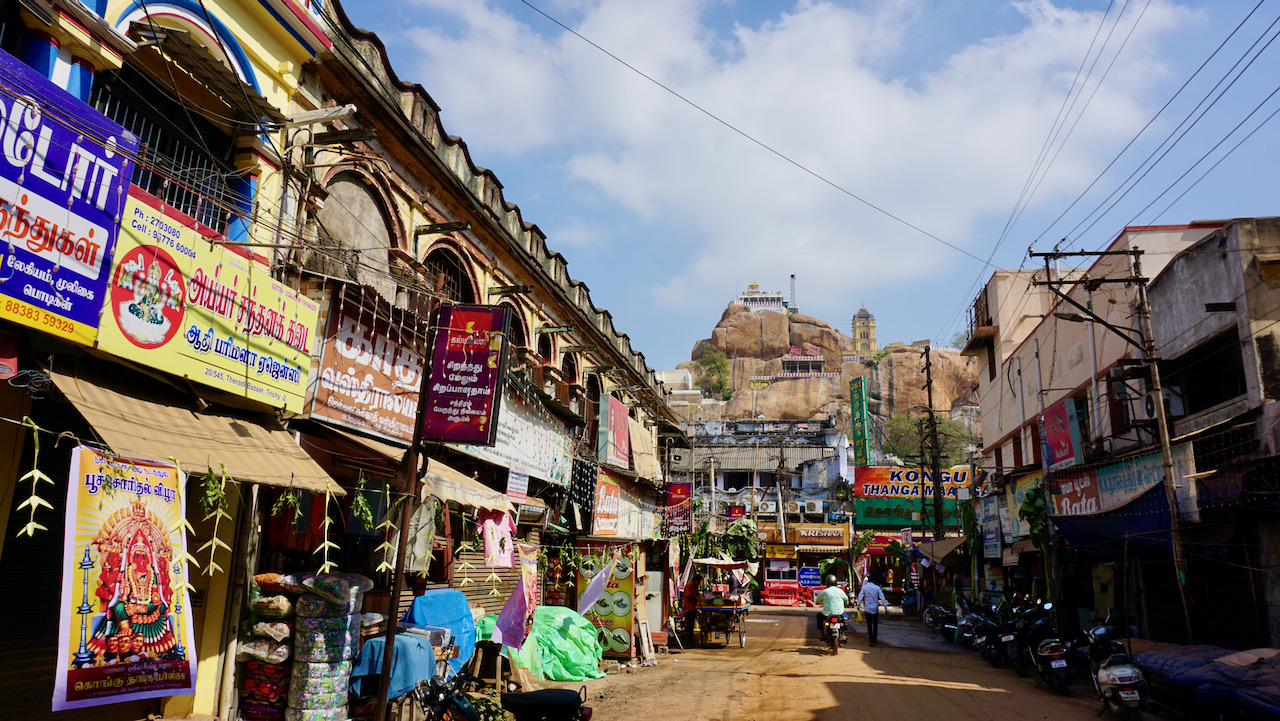 Vorab etwas geschichtliches; Zitat von Wikipedia zum Rock Fort “ Die Hauptsehenswürdigkeit von Tiruchirappalli-Stadt ist das Rock Fort, eine Festungsanlage auf dem steilen 83 Meter hohen Felsen, zu dessen Füßen sich die Altstadt von Tiruchirappalli erstreckt. Das Fort entstand in seiner heutigen Form während der Nayak-Zeit im 17. Jahrhundert. Seine Ursprünge gehen aber weiter in die Vergangenheit zurück, wie zwei Höhlentempel aus der Pallava Zeit des 6. Jahrhunderts zeigt. Der dem Gott Shiva geweihte Thayumanavaswami-Tempel auf halber Höhe des Felsens wurde im 7. Jahrhundert vom Dichterheiligen Sambandar besungen. Damit gehört er zu den heilgen Orten des tamilischen Shivaismus. Auf der Spitze des Felssporns befindet sich ferner der dem Gott Ganesha geweihte Uchi-Pillayar-Tempel. 437 Treppen führen auf den Gipfel, von wo sich eine weite Aussicht auf Tiruchirappalli und über den Kaveri-Fluss hinweg auf den Tempel von Srirangam bietet.