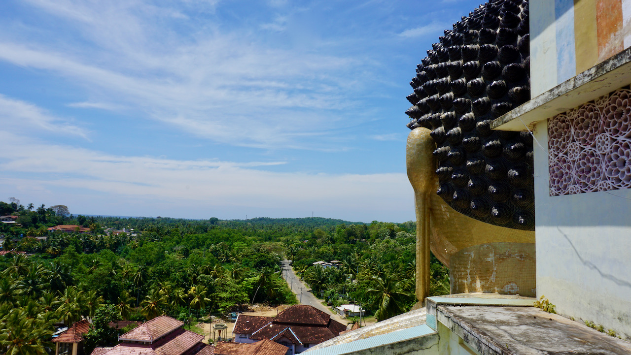 In Polhena treffen wir unsere „alten“ Weggefährten William wieder, den wir auf Arborek in Raja Ampat, Indonesien kennengelernt haben. Das sind doch schöne Aussichten und auf dem Weg dorthin gibt es auch noch einiges anzuschauen. Erster Stopp ist der Goyambokka Strand, eine kleine ruhige Bucht, ganz nett anzusehen, aber da wir noch nicht wirklich weit gefahren sind und noch keinen Lust auf eine längere Pause haben, geht es gleich weiter zum Blow Hole in Kudawella. Das ist eine Felsspalte, aus der eine Wasserfontaine spritzt, wenn die Wellen ordentlich dagegen schlagen. Die Wellen wollen noch nicht so richtig am Morgen, aber wir haben eine schöne Aussicht auf die Küste. Danach geht es zu einem Tempel mit einer 50 Meter hohen Buddha Statue. Hier ist nix los und wir genießen die bunten Hindu-Figuren und die Aussicht über die Schulter des Buddhas. Vor der nächsten Sehenswürdigkeit gibt es erstmal ein Reis & Curry in Dickwella und dann auf zum Leuchtturm in Dondra, dem südlichsten Punkt von Sri Lanka. Einen kurzen Fotostopp gibt es noch in Matara, wo ein Tempel auf einer kleinen vorgelagerten Insel steht, der über eine Brücke zu erreichen ist. Und dann geht es nach Polhena. Wir fahren gleich zu William ins Sunil Guesthouse, entscheiden uns aber dann noch ein paar andere Unterkünfte anzuschauen. Aber die Verabredung zum Abendessen steht. Wir kommen im T.K. Green Garden unter. Der Ort hat es uns noch nicht so wirklich angetan. Eigentlich ist es kein richtiger Ort, nur eine Ansammlung vieler Unterkünfte und ein wirklich winziger Strand. Wir machen einen Spaziergang zum Madiha-Beach, aber auch hier nur Unterkünfte und schicke Strand-Bars entlang der Straße. Wirklich viel Strand ist hier auch nicht zu sehen, was aber auch an der Flut liegen mag. Es ist hier mal wieder sehr deutlich sichtbar, wie das Meer sich immer mehr Land holt. Wir haben aber eine schöne Lokalität gefunden, die eher nur von Einheimischen besucht wird und gönnen uns ein Bierchen. Ach, ist ja doch ganz nett… Das Abendessen mit William war sehr schön. Wir tauschten Reisegeschichten und Tipps aus und es gab ein leckeres Reis & Curry. Der nächste Abend ist auch gleich gesichert.