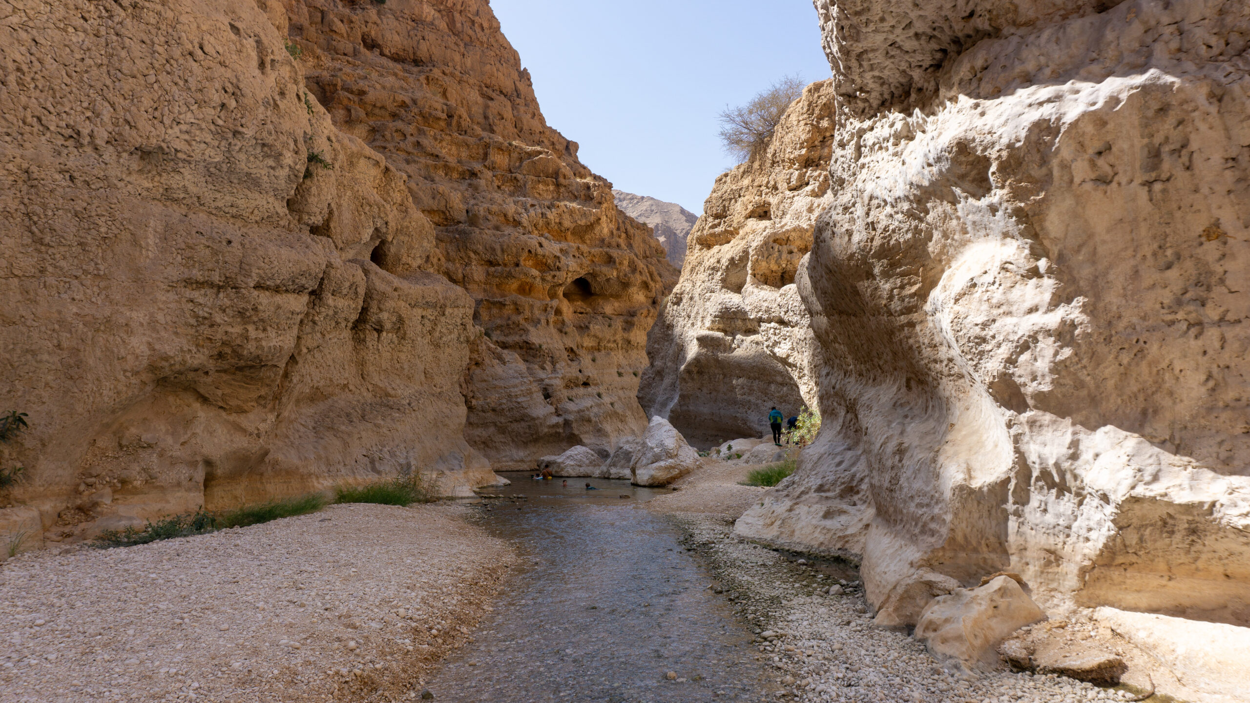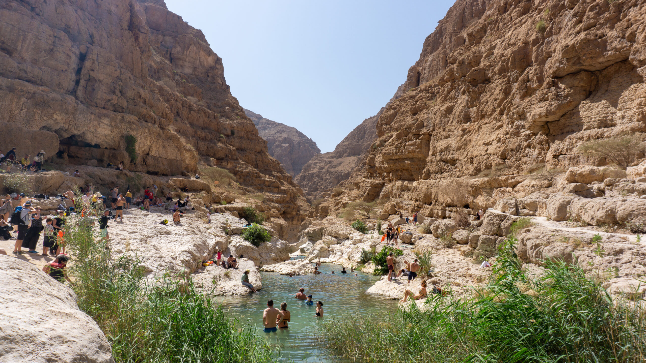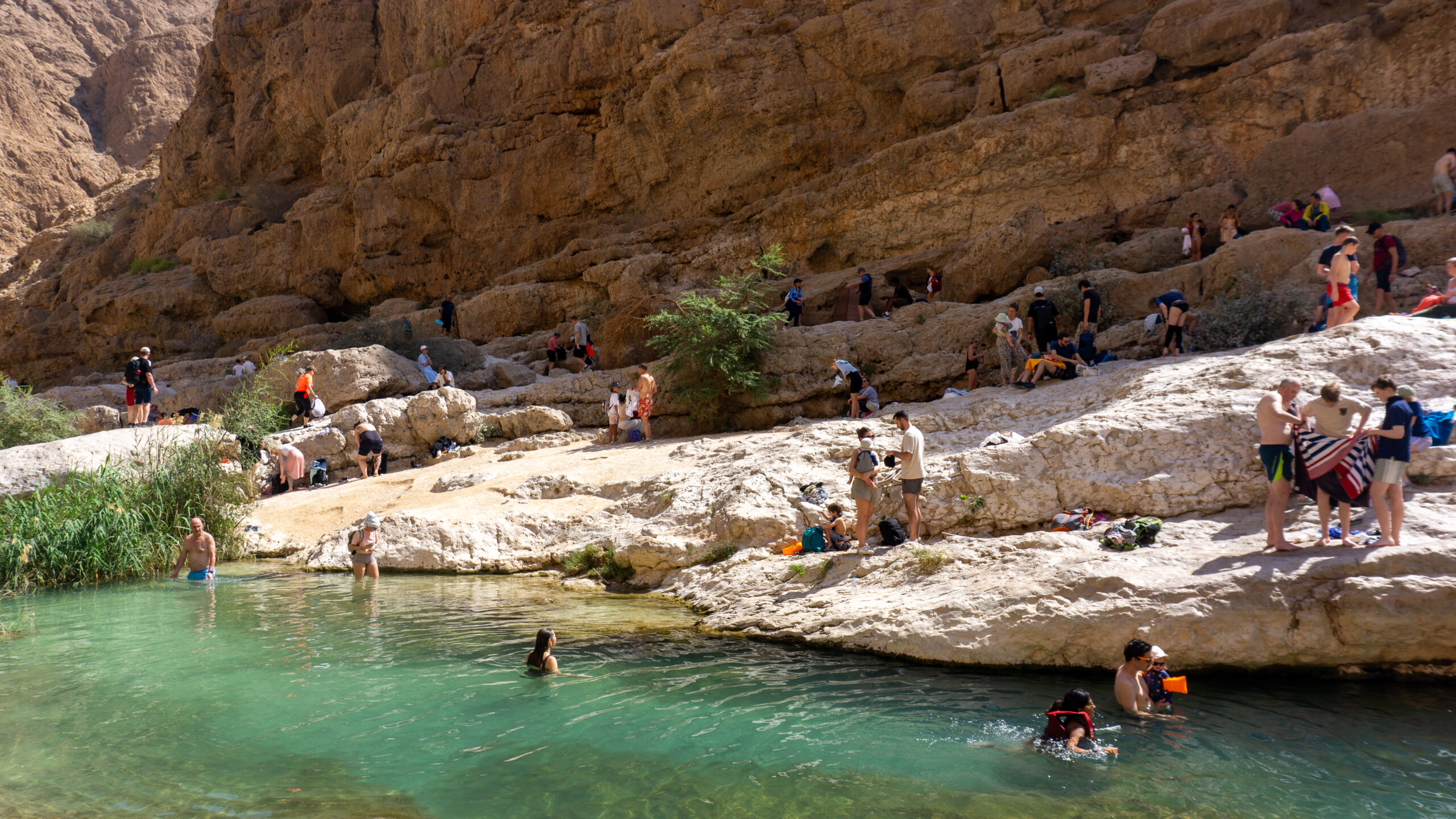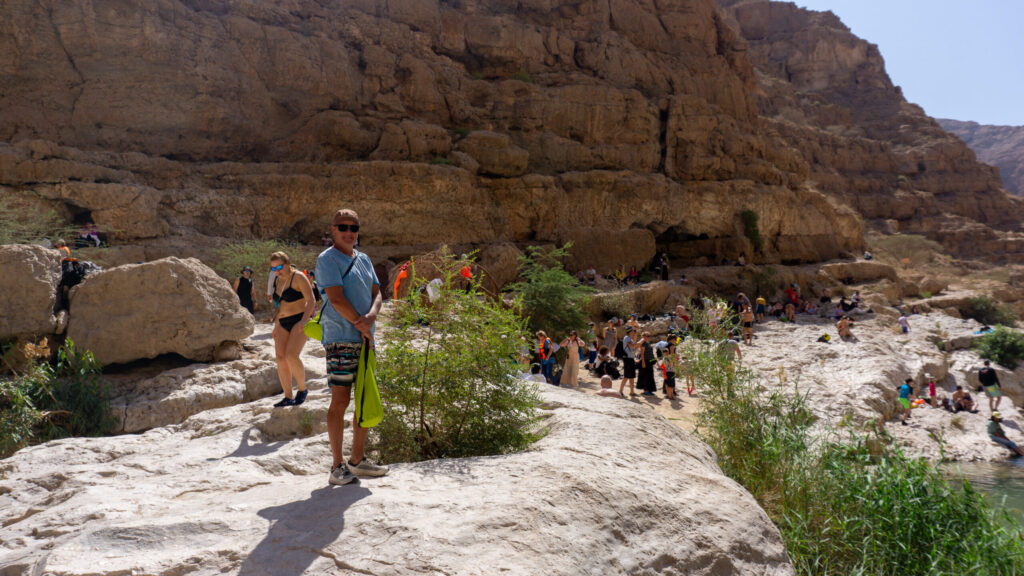 Nach dem reichhaltigen Frühstück ging’s also los. Nach ein paar wenigen Minuten erreichten wir den Parkplatz. Im Vergleich zum vorherigen Wadi ist hier schon ordentlich Betrieb. Zum WWW ( WadiWanderWeg ) müssen wir uns zunächst per Motorboot – die Fahrt dauert ca. 23 Sekunden – ans gegenüberliegende Ufer übesetzen lassen. Nach dem Ausstieg erreichen wir bereits nach wenigen Metern die ersten Pools. Diese ignorieren wir vorerst, denn es sind schon einige Besucher unterwegs. Nach ca. 30 Minuten erreichen wir dann den “ Hauptpool “ und was hier hier sehen erschreckt uns doch sehr…… Frauen in sehr knapper Bademode ( Bikini, String alles dabei ). Wie ignorant der Mensch sein kann……