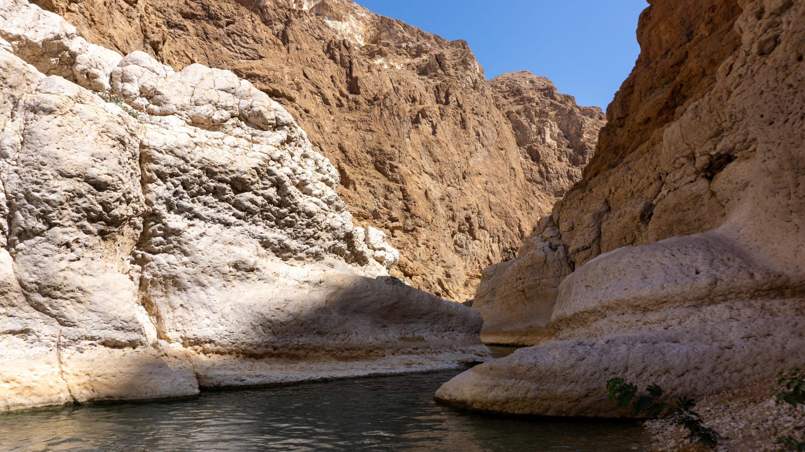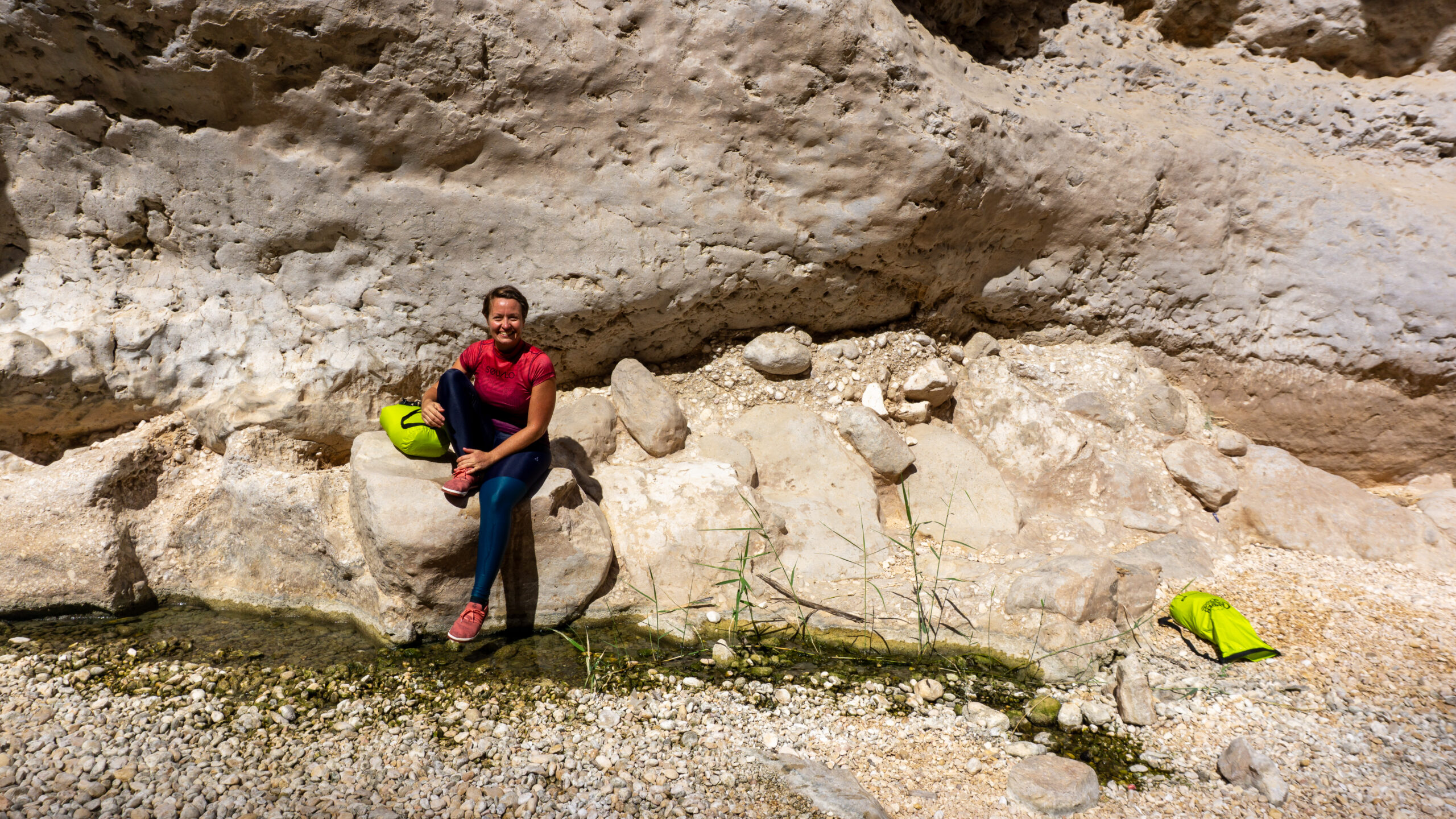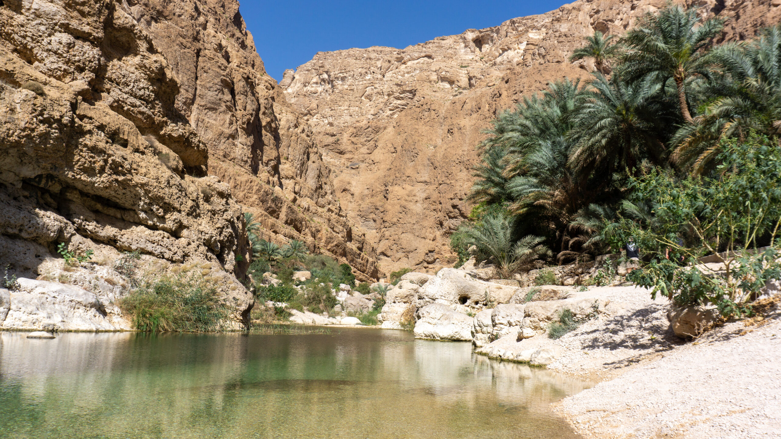 Nach dem reichhaltigen Frühstück ging’s also los. Nach ein paar wenigen Minuten erreichten wir den Parkplatz. Im Vergleich zum vorherigen Wadi ist hier schon ordentlich Betrieb. Zum WWW ( WadiWanderWeg ) müssen wir uns zunächst per Motorboot – die Fahrt dauert ca. 23 Sekunden – ans gegenüberliegende Ufer übesetzen lassen. Nach dem Ausstieg erreichen wir bereits nach wenigen Metern die ersten Pools. Diese ignorieren wir vorerst, denn es sind schon einige Besucher unterwegs. Nach ca. 30 Minuten erreichen wir dann den “ Hauptpool “ und was hier hier sehen erschreckt uns doch sehr…… Frauen in sehr knapper Bademode ( Bikini, String alles dabei ). Wie ignorant der Mensch sein kann……