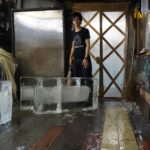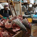 Trockeneis gekühlter Thunfisch wird zurechtgesägt.