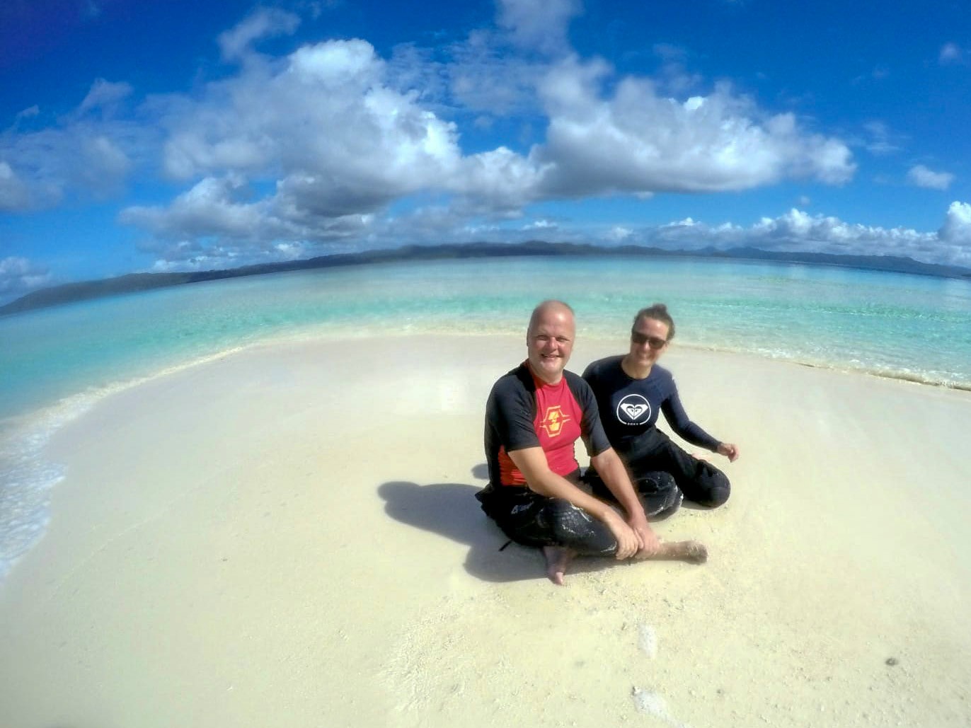 Hier am Chicken Reef gab’s ne flotte Strömung. Für Christl ging’s deshalb auch gleich an die Hand von Sun. Auf ca. 30 Metern beruhigte sich die Strömung zusehends. An die Hand ist doof aber Sicherheit geht vor. Trotzdem gab es ne Menge zu sehen… Grey Reef Shark, Thunfisch, Barracuda, Scorpion Fish, Napoleon Fisch, Batfish sowie viele weiter tolle bunte Fische und Korallen. Nach dem Tauchgang ging’s auf zur Pause auf eine kleinen Sandbank, gelegen zwischen Mansuar und Kri. Die Bilder sprechen für sich.