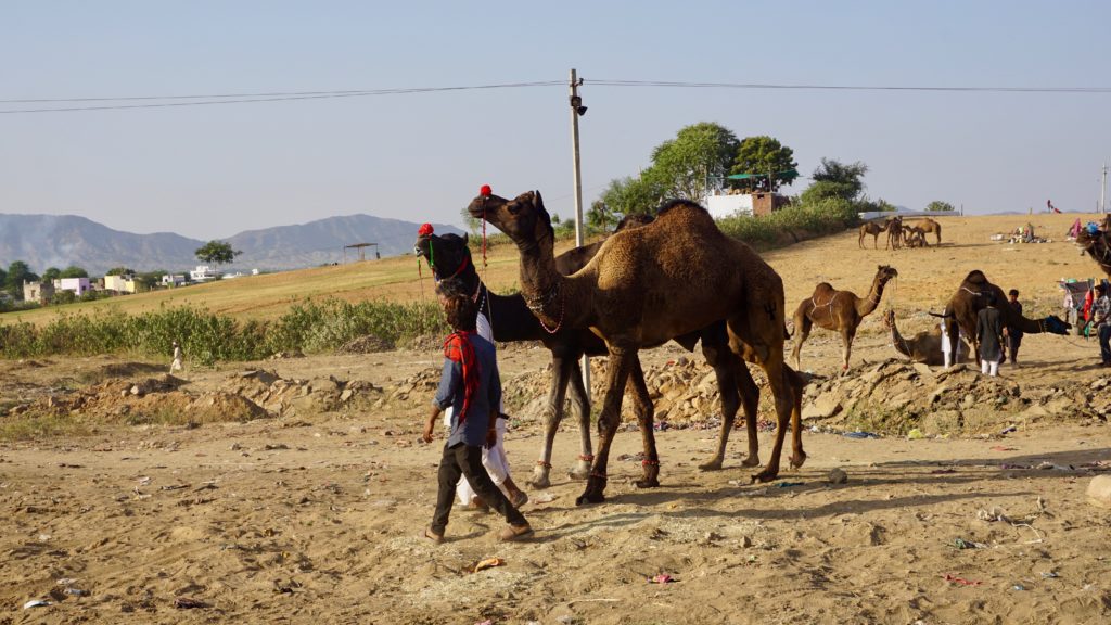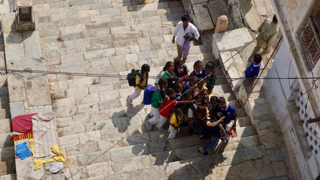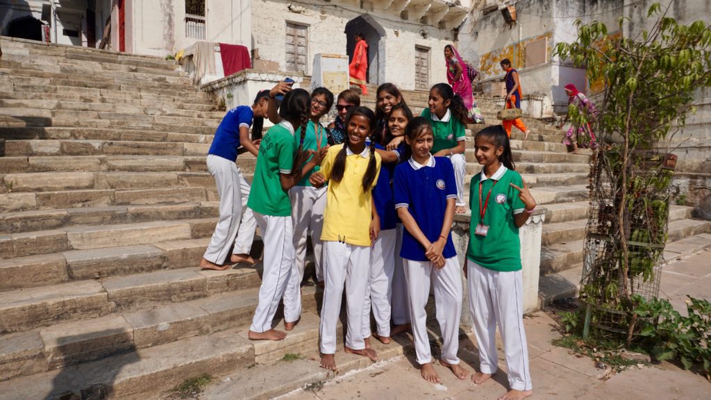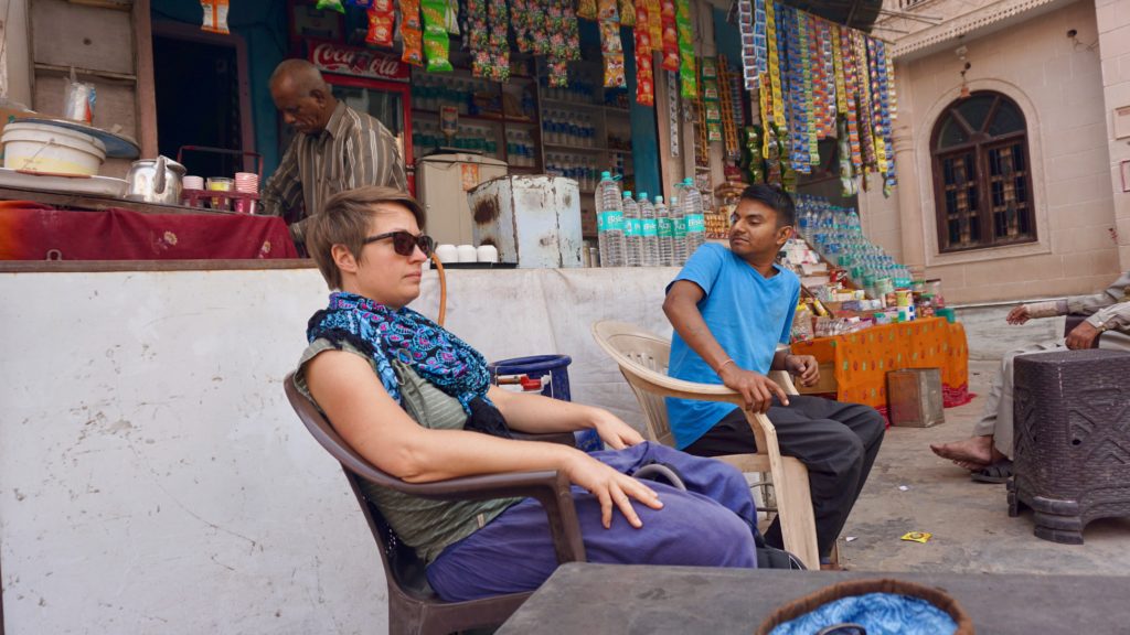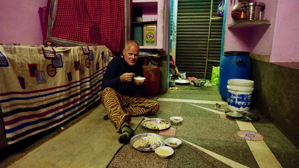 Die Nacht war….. was sollen wir sagen…. quasi nicht vorhanden. Dass es in Indien laut ist, wissen wir, dass es keine Isolation an den Häusern gibt auch, aber das war wirklich hart. An Einschlafen war nicht zu denken, da überall geredet, gesungen, telefoniert und über uns Möbelrücken gespielt wurde. Irgendwann kehrte dann Ruhe ein, aber um 04:00 Uhr war vorbei! Irgendeine Maschine mit Motor und Gepolter ging los. Wie uns später der Hotelbesitzer erklärte stellt der Nachbar morgens Essen her, das er dann tagsüber verkauft. Was das sein soll wissen wir nicht, aber da war uns klar, dass das keine Ausnahme war sondern uns auch in der nächsten Nacht den Schlaf rauben wird. Aber nein, das ist noch nicht alles. Die Maschine polterte bis um 06:00 Uhr und um 05:30 Uhr ging dazu noch Musik los. Na ja, Musik ist übertrieben, ein gebetsähnlicher Gesang bestehend aus einer einzigen Strophe, die in Endlosschleife bis ca. 07:30 Uhr dröhnte. Und dann natürlich wieder der ganz normale Alltagslärm des indischen Lebens…. Welcome to India! Aber so lieben wir es schließlich auch. Also, raus aus den Federn und mitmischen! Zuerst gab es wieder einen Tee, dieses Mal Ingwer-Limette mit Honig, der hatte es in sich und wir waren wach! Satt waren wir übrigens immer noch von der Paprika am Vortag. Wir schauten nochmals beim Kamelmarkt vorbei, aber heute waren noch weniger Kamele da, also ab zum See. Und da bot sich so einiges für unsere Augen und Ohren. Es macht so ein Spaß sich unter’s Volk zu mischen, aber wir mussten natürlich auch wieder für einige Selfies herhalten. Da kennen die Jungs und Mädels auch nix, es wird an dir gezerrt und gezogen bis du die richtige Position hast und wenn du mal nicht richtig in die Kamera schaust, dann bitte nochmal. Einer Schulklasse hatten wir es angetan, sie wollten wissen wo wir her kommen etc. Die üblichen Fragen eben, und als Winnie eines der Mädchen fragte ob sie einen Freund hat, waren alle peinlich berührt, es wurde gekichert und gegackert, total niedlich. Wir beobachteten das Treiben noch ein wenig von einer Dachterrasse bei einem Tee und deckten uns mit nützlichen und umnützlichen Souvenirs ein. Der Teemann unseres Vertrauens, gleich gegenüber von unserem Hotel, bot uns an, dass wir auch zum Essen zu ihm kommen können, das wollten wir auch machen. Wir schauten uns den Sonnenuntergang auf der Terrasse unseres Hotel an, entspannten uns ein wenig und gingen dann runter zum Abendessen. Wir dachten, wir sitzen draußen vor seinem Kiosk wo er auch den Tee ausschenkt, aber er lud uns in sein Haus ein. Zuerst schickte er aber alle seine Kinder raus. Wir sagten, dass sie wegen uns nicht gehen müssen, aber nein, wir seien seine Gäste und das ist okay so. Wir sollten uns auf den Boden setzen und dann kochte Muddie für uns! Grandios! Es gab Gemüse, weißen Reis, ein Curry in Form einer Kartoffel-Blumenkohl-Suppe, Chapati, Dal ( Linsen ), Aloe Vera Chutney, Bratreis mit Gemüse und zwischendurch reichte uns die Hausdame immer Mal eine kleine Leckerei, irgend so eine Zuckermasse, die wir zum Chapati essen sollten, eine Dattel und am Ende eine Art bröseliger Keks aus ganz viel Zucker und Zimt. Herrlich. Vaddi schaute immer mal nach dem Rechten, aber er musste ja draußen seine Kundschaft bedienen. Muddi konnte kein Englisch, saß aber trotzdem bei uns wir wir unterhielten uns mit Händen und Füßen. Es war einfach nur schön! Das sind so Momente, in denen wir unendlich dankbar sind, so etwas erleben zu dürfen.